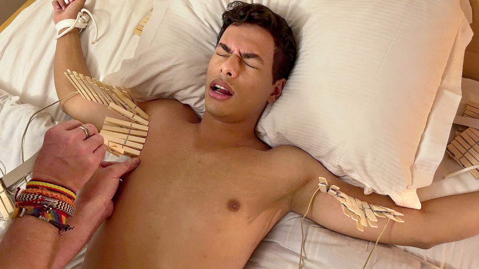 Jay has been enjoying his feast of cock in part one, but the fun is just starting for this tanned blindfolded boy. Tied up against the beam the young captive is soon naked, his gorgeous hooded cock ready to be played with. Master Kane and blond assistant Mitch get to work with the painful clothespins, pinching the boy's naked form, including his big saggy ball sack! The pain might be flooding his senses but the wanking and sucking they deliver soon has his lovely penis hard and wet.